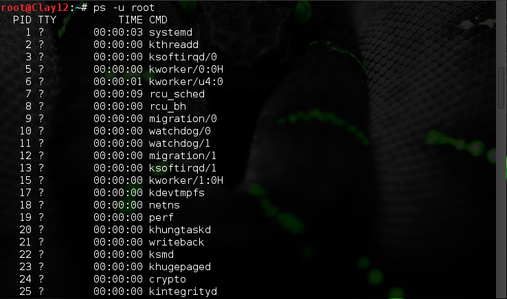 - Untuk melihat faktor/elemen lainnya, gunakan option –u (user). %CPU adalah presentasi CPU time yang digunakan oleh proses tersebut, %MEM adalah presentasi system memori yang digunakan proses, VSZ (Virtual Set Size) adalah jumlah memori yang dialokasikan, RSS (Resident Set Size) adalah ukuran memori yang sedang digunakan, STAT berisi S (Sleeping) dan R (Running), START adalah kapan proses tersebut diaktifkan, TIME adalah waktu yang dibutuhkan untuk memproses task tersebut.[Gambar ps u]